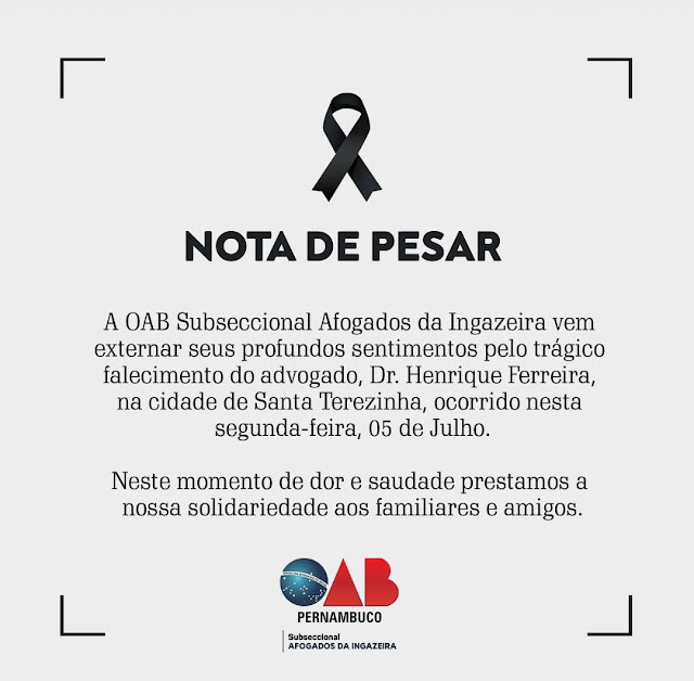 A OAB Subseccional em Afogados da Ingazeira emitiu nota de pesar pelo trágico falecimento de Dr. Henrique.