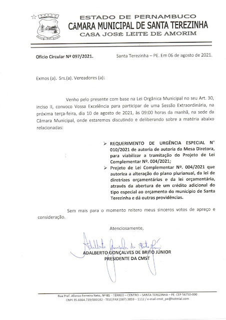 Ofício da convocação para sessão extraordinária.