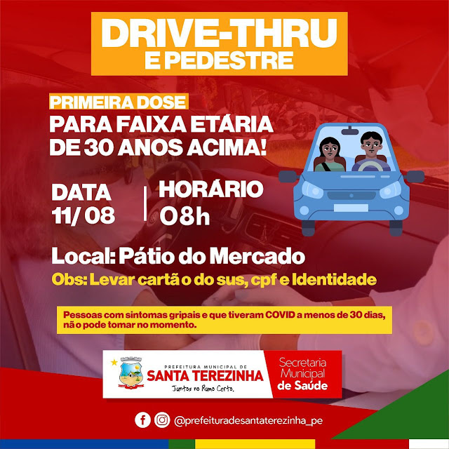 A secretaria municipal de saúde de Santa Terezinha estará promovendo um novo Drive Thru de vacinação nesta quarta-feira, 11 de agosto no Pátio do Mercado Público a partir das 8hrs da manhã para a faixa etária de 30 anos a cima. Até o momento 6.407 pessoas foram imunizadas contra a Covid, sendo que 4.872 receberam a 1ª dose e 1.535 receberam as duas doses.