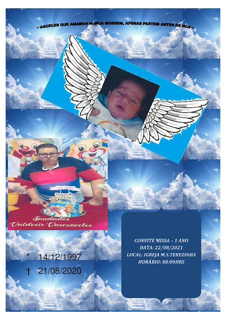 A família Vasconcelos vem através desta nota convidar parentes, amigos e todo o povo de Deus para participar da missa de um ano de saudades em sufrágio da alma do saudoso jovem Valdecir Vasconcelos, neste próximo domingo às 8 horas da manhã na Matriz de Santa Terezinha.