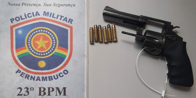No final da manhã de ontem (27.08) o efetivo do 23º BPM, ao realizar patrulhamento foi acionado pelo agente da Policia Civil, informando de que um indivíduo estaria armado no centro da cidade. Chegando ao local o policiamento realizou abordagem e encontrou em baixo do balcão de um bar, um revólver calibre 38, marca Rossi com 06 munições do mesmo calibre intactas, pertencente ao acusado.