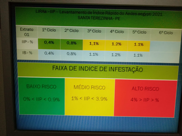 A equipe de endemias de Santa Terezinha comunicou na tarde desta quarta-feira (01.09) que realizou o 5° ciclo do LIRAa de 2021 nos dias 30 e 31 de agosto e o IIP ficou em 1.1% na infestação predial pelo Aedes aegypti. “Agradecemos a todos aqueles que vem nos ajudando no combate ao transmissor da dengue cuidando de seus reservatórios de água colocando peixes larvofagos (piabas) ou cobrindo os mesmo e pedimos para aqueles moradores que não cuidam de seus reservatórios de água que se unam a nós nessa luta e vamos manter uma cidade sem dengue,