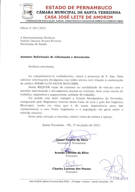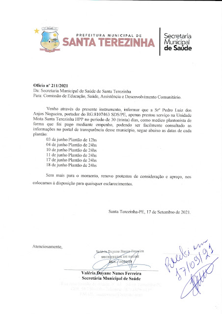 Em junho deste ano houve uma polêmica sobre a contratação de um médico, que segundo denúncias em redes sociais, estaria trabalhando sem CRM no Hospital de Pequeno Porte (HPP) em Santa Terezinha, foi quando a Comissão de Saúde da Câmara de Vereadores do município formada pelos vereadores Júnior de Branco, Nôdo de Gregório e Charles Lustosa, atentos aos acontecimentos enviaram ofício a Secretária de Saúde Valéria Ferreira solicitando informações e nessa sexta-feira, 17 de setembro ela enviou resposta sobre o caso.
