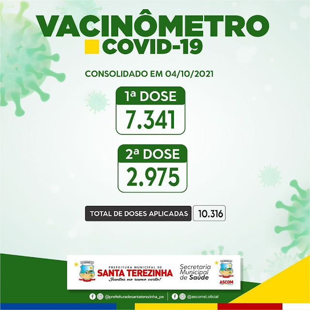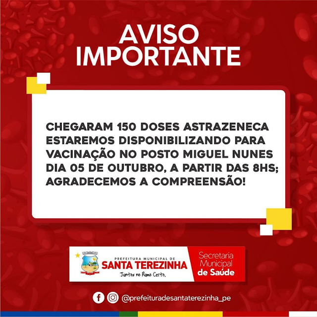 A Secretaria de Saúde de Santa Terezinha confirmou em nota nessa segunda-feira (04.10) que chegaram 150 doses da vacina da Astrazeneca que serão disponibilizadas para aplicação no Posto Miguel Nunes da Rocha, na Rua Inácio Mariano Valadares a partir de hoje (05). Assim como outras cidades, a Terrinha Santa passou por dificuldades para aplicar a 2ª dose do imunizante da Fiocruz, que faltou no país inteiro devido a ausência de insumos estrangeiros para a fabricação.