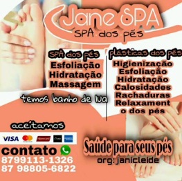 Santa Terezinha agora tem uma nova opção para saúde deseus pés. Jane Spa oferece serviços de Spa para seus pés com esfoliação, hidratação e massagens, ainda temos plásticas dos pés com higienização, esfoliação, hidratação, calosidades, rachaduras e relachamento dos pés. Ainda temos banho de lua.