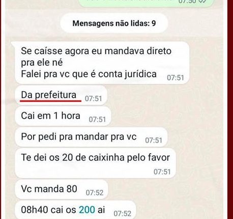 Em um print enviado pelo vereador, feito por um de seus colaboradores, mostra o golpista reclamando que o Pix não teria caído. A vitima conclui: “Se caísse agora eu mandava direto pra ele né, falei pra você que é conta jurídica, da prefeitura… e pede agilidade para um estorno.
