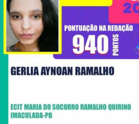 A jovem Gerlia Aynoan Ramalho de 18 anos, natural de Imaculada tirou 940 pontos na redação do Enem e se tornou destaque na rede de ensino Imaculadense. Gerlia é residente da rua José Guedes e filha de Hosana Ramalho. Ela concluiu o ensino médio na escola Maria do Socorro Ramalho Quirino e dedicou muitas horas de estudos, com dedicação e motivação.