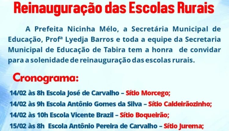 A Prefeitura de Tabira anunciou a inauguração da reforma de 07 escolas rurais. Nesta segunda-feira (14) serão reinauguradas as escolas José de Carvalho, no Sítio Morcego; Antônio Gomes da Silva, no Sítio Caldeirãozinho; e Vicente Brazil, no Sítio Boqueirão. Na terça-feira (15) será a vez das escolas Antônio Pereira de Carvalho, no Sítio Jurema; e José Caetano da Silva, no Sítio Cajá.
