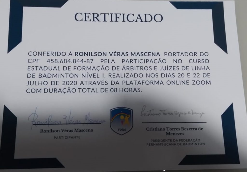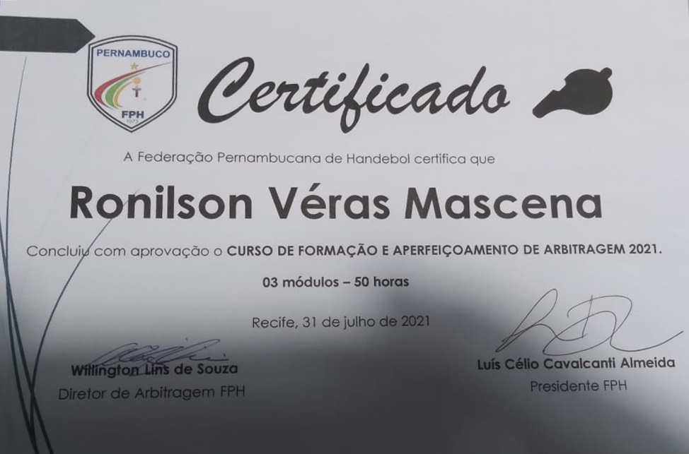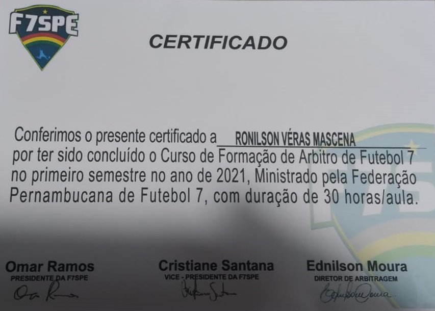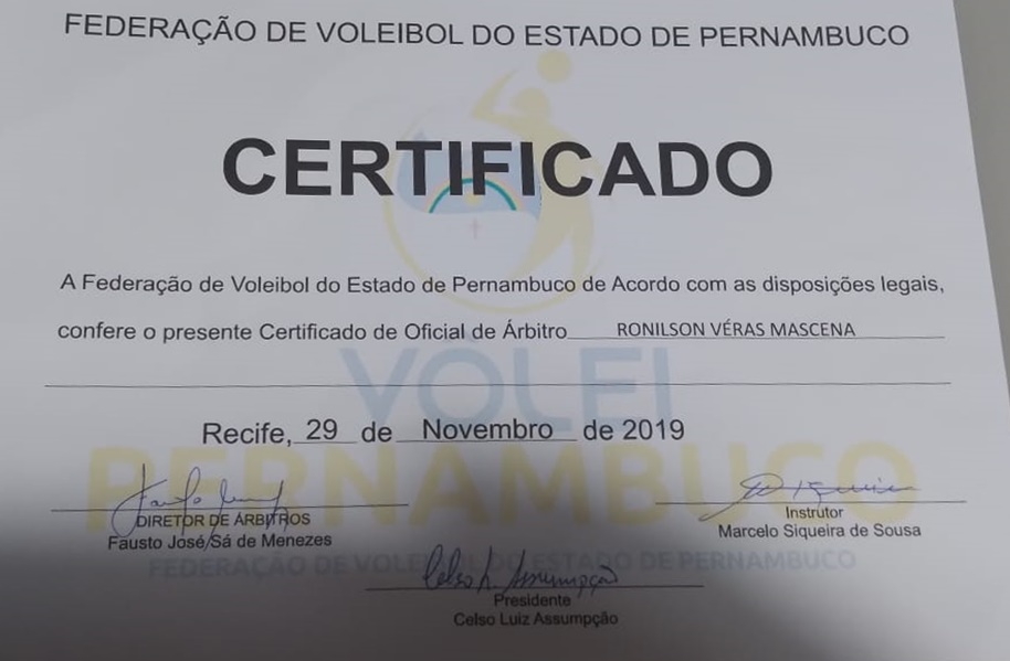 “Consegui, depois de muito esforço, dedicação e persistência, participar e concluir Cursos de Formação de Árbitros, das seguintes Federações do Estado de Pernambuco: