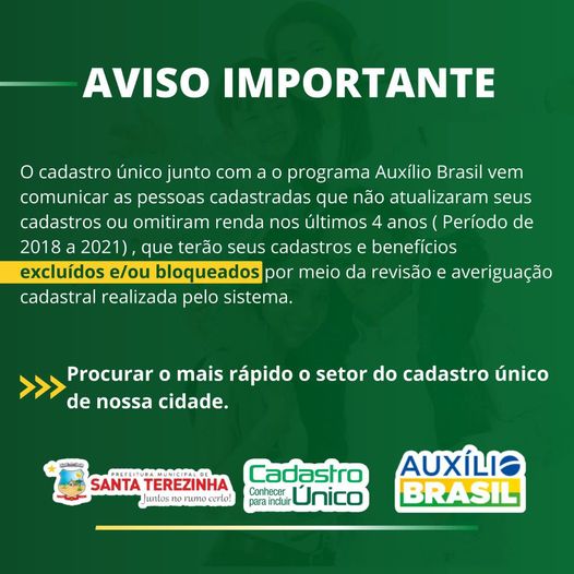 O município de Santa Terezinha emitiu comunicado para as pessoas que não fizeram a atualização cadastral, ou omitiram renda nos últimos quatro (04) anos, ou seja de 2018 a 2021 no Cadstro Único e no Progra Auxílio Brasil, que seus benefícios serão excluídos ou bloqueados por meio da revisão e averiguação cadastral realizado pelo sistema.