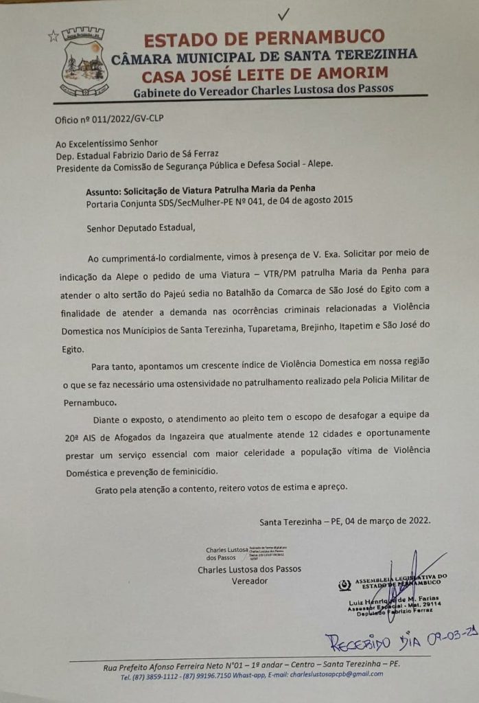 O vereador de Santa Terezinha Charles Lustosa esteve na manhã desta quarta-feira, 09 de março no Recife, no gabinete do deputado estadual Fabrizio Ferraz solicitando uma viatura da Maria da Penha para atender os municípios de Santa Terezinha, São José do Egito, Tuparetama, Brejinho e Itapetim. No ofício entregue ao parlamentar estadual, Charles aponta um crescente índece de violência doméstica na região do Pajeú e que a designação de mais uma viatura vai ajudar desafogar a 20ª AIS de Afogados da Ingazeira.