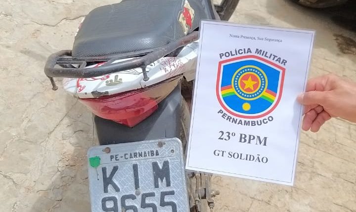 O policiamento militar do 23º BPM conseguiu tirar mais uma moto irregular de circulação em Solidão. O veículo estava na posse de um indivíduo que apresentou uma atitude suspeitada na área rural do município, quando estava conduzindo a motocicleta HONDA CG 150 FAN, Vermelha, ano 2010 de placa KIM-9655.