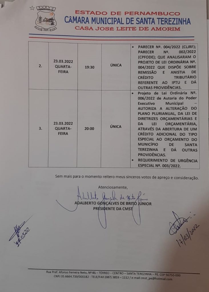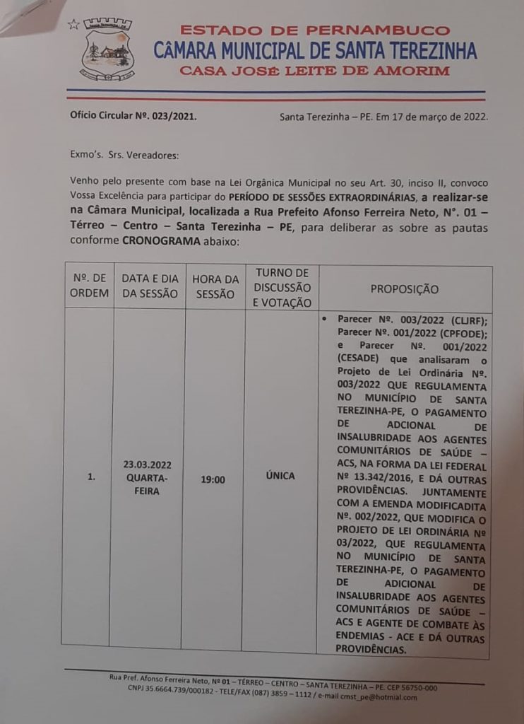 A Câmara de Vereadores de Santa Terezinha terá Sessão Extraordinária na próxima quarta-feira, 23 de março. O presidente do Legislativo Adalberto JR (Drº Júnior) fez a convocação para os parlamentares nesta quinta (17) para deliberar sobre a regulamentação do abono de isalubridade para os Agentes Comunitários de Saúde (ACS) e Agentes Comunitários de Endemias (ACE).