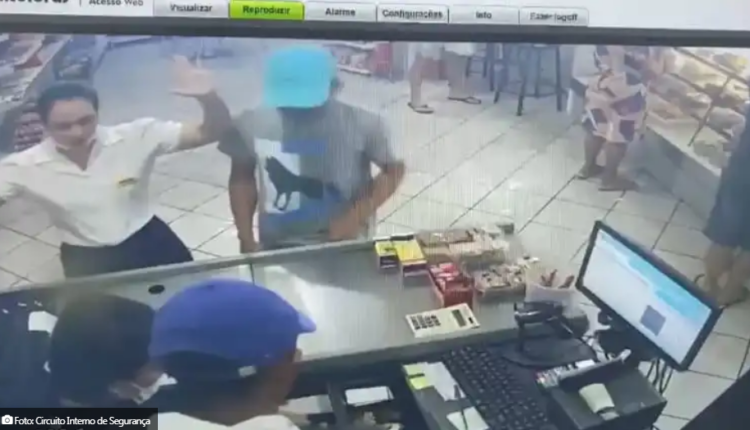 As câmeras de segurança do estabelecimento capturaram toda a ação. Pelas imagens, é possível ver quando dois indivíduos armados, um deles trajando camisa cinza, short vermelho e boné, e o outro um moletom preto, calça jeans e boné, chegam a panificadora e anunciam o assalto.