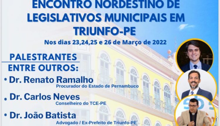 De amanhã e até a próxima sexta-feira, Triunfo, a 500 km do Recife, no Sertão do Pajeú, sedia o 1º Encontro Nordestino de Legislativos Municipais, promoção da União dos Vereadores do Brasil – UVB-PE. Reunirá vereadores de todo o Nordeste. A abertura será feita com uma palestra do advogado municipalista João Batista Rodrigues sobre a temática “Atos de Pessoal”. Em seguida, o promotor de justiça Vinicius Costa abordará o tema “A Força do Poder Legislativo Municipal”.