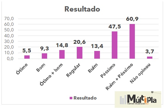 Quando a população é chamada a classificar a gestão, 5,5% dizem ser ótima, 9,3% a classificam como boa, 20,6% que a avaliam como regular, 13,4% que dizem ser ruim e 47,5% que a colocam como péssima. Não sabem ou não opinaram, 3,7%.