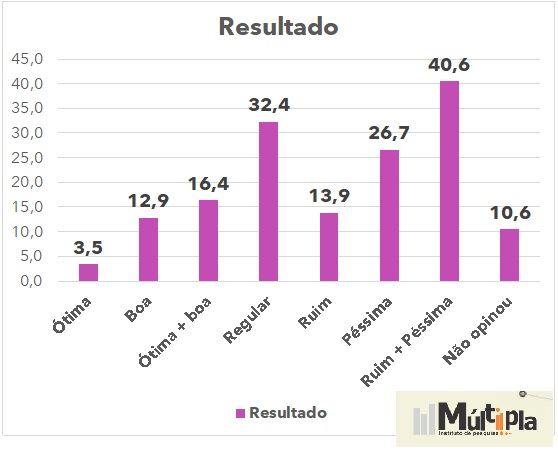 Quando a população é chamada a classificar a gestão, 3,5% dizem ser ótima, 12,9% a classificam como boa, 32,4% que a avaliam como regular, 13,9% que dizem ser ruim e 26,7% que a colocam como péssima. Não sabem ou não opinaram, 10,6%.