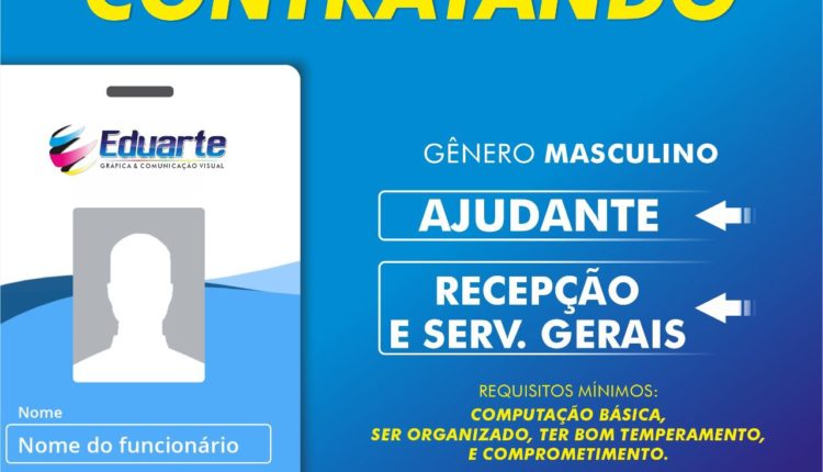 A Gráfica Eduarte & Comunicação Visual em Santa Terezinha está contratando servidor masculino para os serviços de ajudante, recepção e serviços gerais. Os requesítos mínimos para os empregos são que os candidatos tenham curso de computação básica, ser organizado, ter bom temperamento e comprometimento.