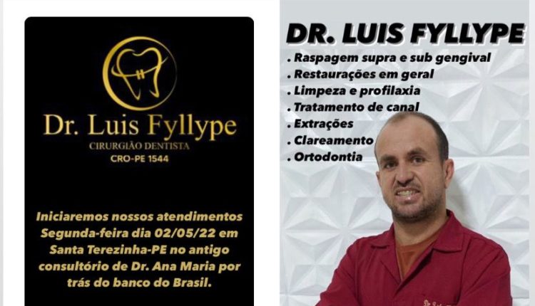 O Consultório Odontológico do Drº Luís Fyllype está funcionando em Santa Terezinha no local onde atendia a Drª Ana Maria, por trás do Banco do Brasil, ao lado da Junta do Serviço Militar, das 9hrs ao meio dia e das 14hrs às 17hrs, de segunda a sexta-feira.