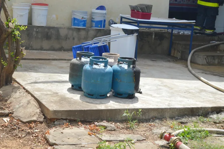 ”Houve a intervenção inicial do efetivo e conseguiram conter as chamas. Houve alguns danos na estrutura do teto, mas não houve registro de vítimas. Não houve explosão de botijão, após o vazamento da mangueira em alto continuo já iniciou a combustão do gás que estava vazando e a válvula de segurança dos quatro botijões romperam e todo esse gás pega fogo, fica as labaredas e foi contido pelas guarnições”, explicou o Major Wamberg.