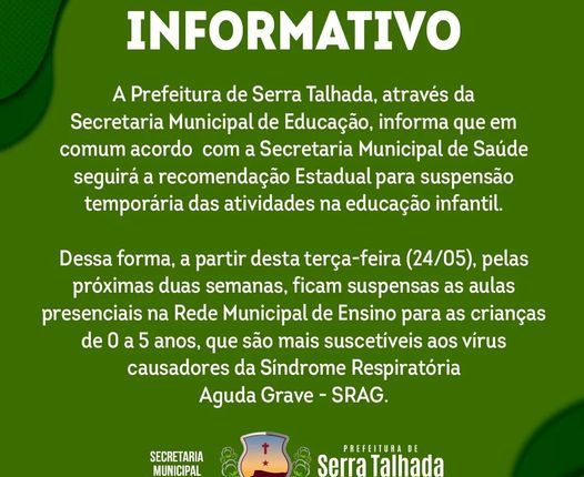 Em nota divulgada nas redes sociais da Prefeitura de Serra Talhada na noite desta segunda-feira (23), a Prefeitura informou que através da Secretaria Municipal de Educação, em comum acordo com a Secretaria Municipal de Saúde, seguirá a recomendação Estadual para a suspensão temporária das atividades na educação infantil.