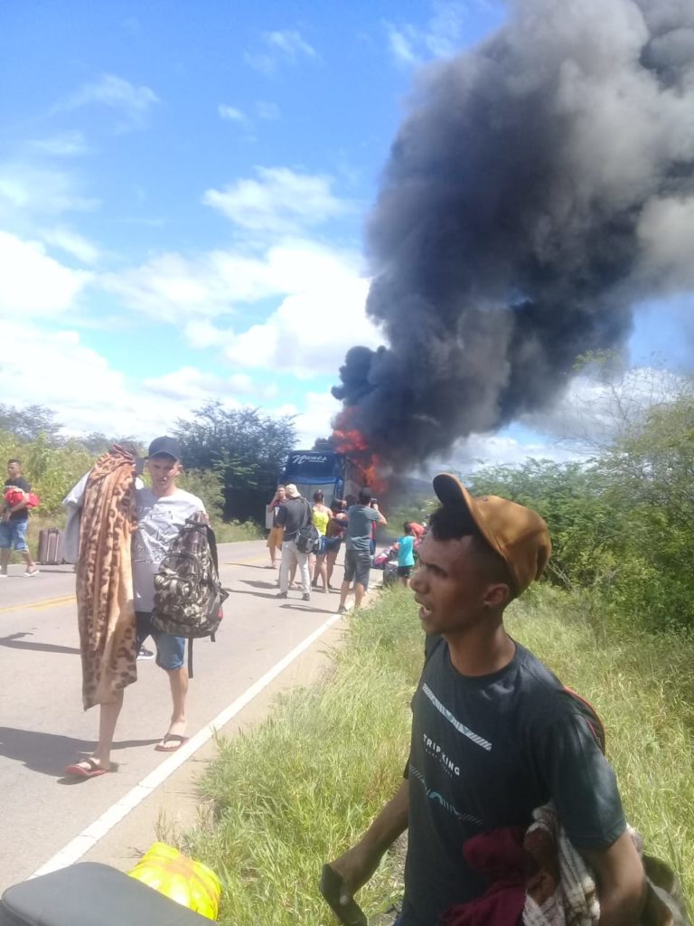 Ônibus da Nunes Turismo que vinha de SP para Itapetim e Santa Terezinha pega fogo entre Flores e Calumbi.