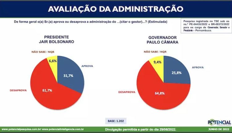 De acordo com a pesquisa, 31,7% dos pernambucanos aprovam o governo Bolsonaro e apenas 25,8% gostam da gestão de Paulo Câmara. De acordo com a Potencial, 6,6% dos eleitores de Pernambuco ficam em cima do muro, na hora de avaliar Bolsonaro e 9,8% no caso de Câmara Após 16 anos de PSB no poder, o Estado bateu recorde de pobreza: 44% da população, diz Instituto Mobilidade e Desenvolvimento Social (IMDS).