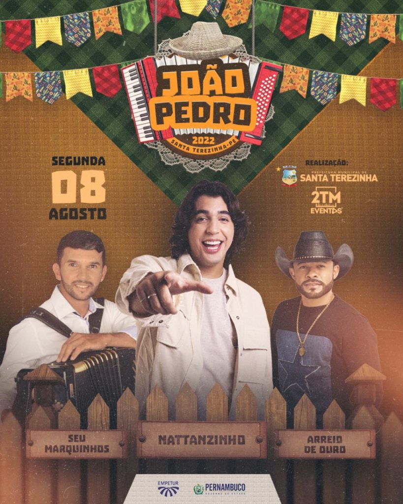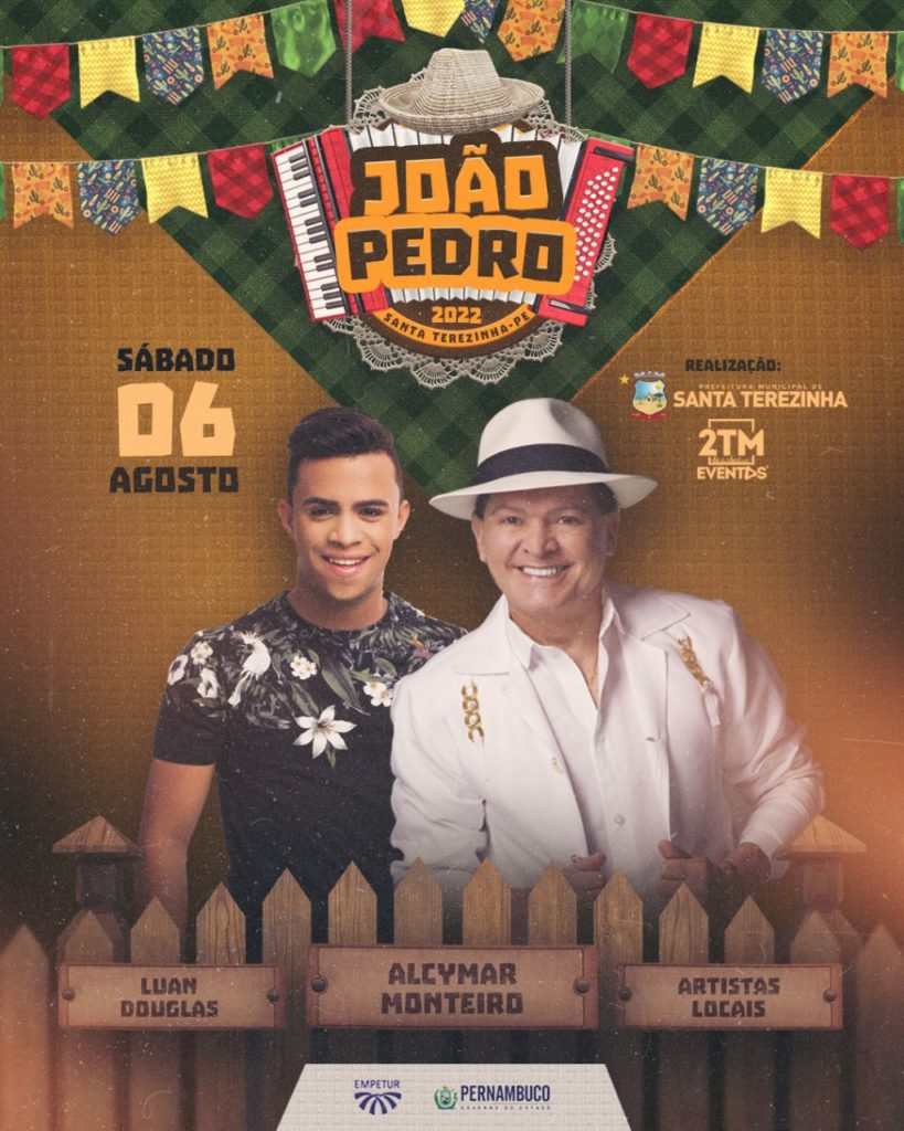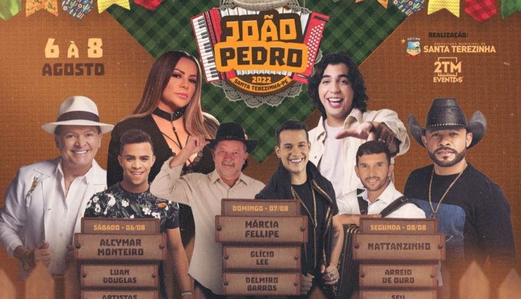 A tão esperada programação do João Pedro foi divulgada pela prefeitura de Santa Terezinha, através de vídeo divulgado com o prefeito Delson Lustosa. O evento será realizado nos dias 06, 07 e 08 de agosto e trás atrações como Alcymar Monteiro, Luan Douglas, Márcia Fellipe, Glício Lee, Delmiro Barros, Nattanzinho, Arreio de Ouro e Seu Marquinhos, além dos artistas locais.
