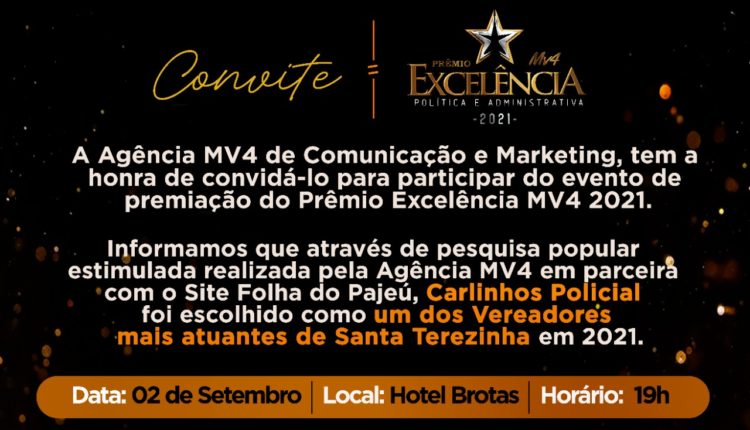 O vereador de Santa Terezinha Carlinhos Policial vai receber o Prêmio Excelência, Política e Administrativa referente ao ano de 2021, como um dos mais atuantes. A premiação é organizada pelo MV4 de Comunicação e Marketing, que fez pesquisa estimulada em parceria com o Site Folha do Pajeú.