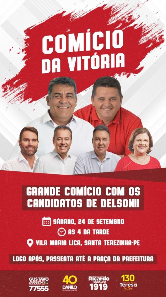 O prefeito Delson Lustosa e o vice, Dada de Adeval estarão promovendo um movimento político em Santa Terezinha no próximo sábado, 24 de setembro. Haverá uma passeata pelas ruas da cidade, e em seguida um Comício da Praça Amaro Paes de Lira (Praça da Prefeitura).