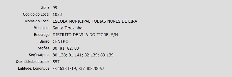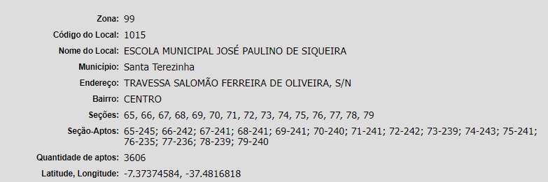 Segundo o consultado, são os mesmos três locais de votação de sempre, a Escola José Pulino de Siqueira, EREM Santa Terezinha (as duas na sede)  e a Escola Tobias Nunes na Vila do Tigre. A José Paulino de Siqueira terá quinze (15) seções, a EREM dez (10) e a Tobias Nunes quatro (04) seções, totalizando ao todo vinte e nove (29) seções.