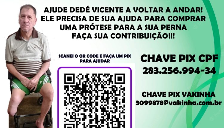 A Campanha para ajudar o ex-vereador Dedé Vicente de Santa Terezinha está na última semana. Próximo sábado, 01 de outubro se completará um mês de campanha, com doação em PIX com a Vakinha Online. Dedé Vicente está precisando de uma prótese para a sua perna direita. Dedé luta contra o diabetes e teve que ter parte de sua perna amputada devido as consequencias da doença.