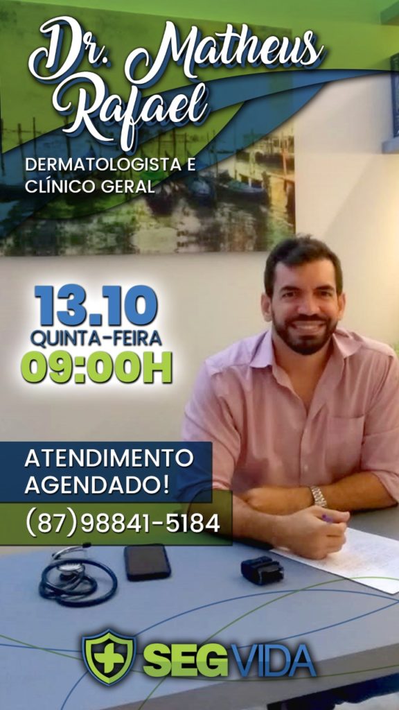 A SegVida em Santa Terezinha comunica a toda população que nesta quinta-feira, 13 de outubro o Dermatologista Drº Matheus Rafael estará atendendo a partir das 09 horas da manhã. Reserve hoje mesmo seu atendimento entrando em contato pelo número (87) 98841-5184.