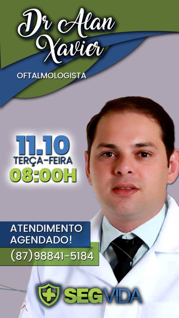 A SegVida em Santa Terezinha comunica a toda população que nesta terça-feira, 11 de outubro o Oftomologista Drº Alan Xavier estará atendendo a partir das 08 horas da manhã. Reserve hoje mesmo seu atendimento entrando em contato pelo número (87) 98841-5184.