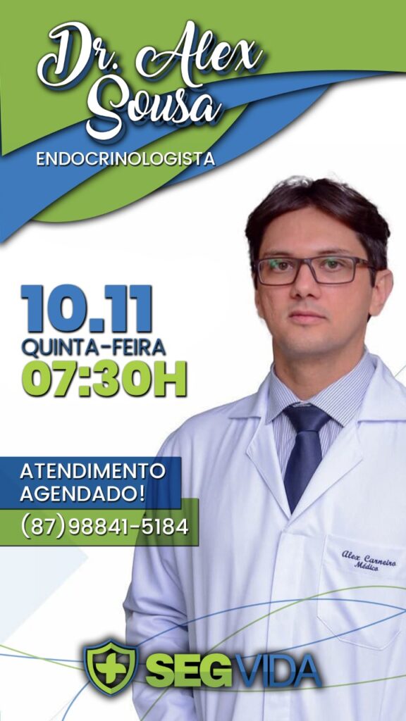 A SegVida em Santa Terezinha comunica a toda população que nesta quinta-feira, 10 de novembro o Endocrinologista Drº Alex Souza estará atendendo por agendamento a partir das 7h30min. Reserve agora mesmo sua consulta entrando em contato pelo número (87) 98841-5184.