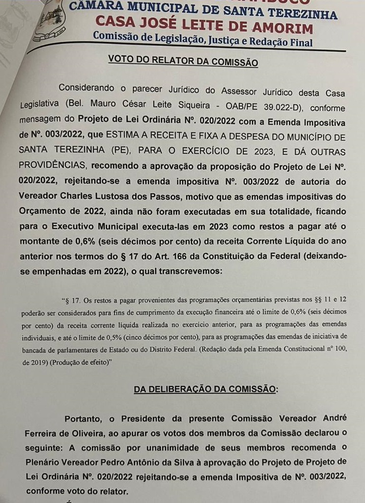 A Câmara de Vereadores de Santa Terezinha terá sessão ordinária na próxima quarta-feira, 30 de novembro onde será votada a Lei Orçamentária Anual (LOA) de 2023 onde constam as chamadas Emendas Impositivas, aquelas em que os vereadores indicam ações, projetos e obras que o governo municipal é obrigado a executar. Dos nove vereadores Terezinhenses, apenas Charles Lustosa apresentou Emenda Impositiva.