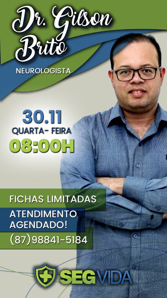 A SegVida em Santa Terezinha comunica a toda população, que nesta quarta-feira, 30 de novembro o Neurologista Drº Gilson Brito estará atendendo por agendamento a partir das 08 horas da manhã. As fichas são limitadas. Reserve hoje mesmo seu atendimento entrando em contato pelo número (87) 98841-5184.
