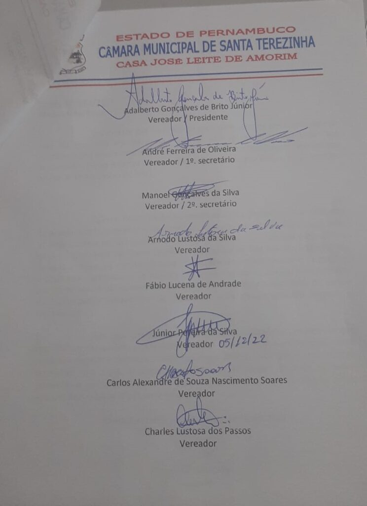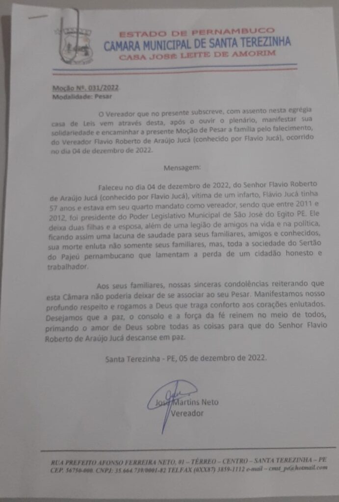 Atendendo a solicitação do vereador Neguinho de Danda, a Câmara de Vereadores de Santa Terezinha aprovou nessa segunda-feira (05.12) uma Moção de Pesar pelo falecimento do vereador de São José do Egito Flávio Jucá. Ele foi vereador por quatro (04) mandatos e faleceu de infarto nesse fim de semana.