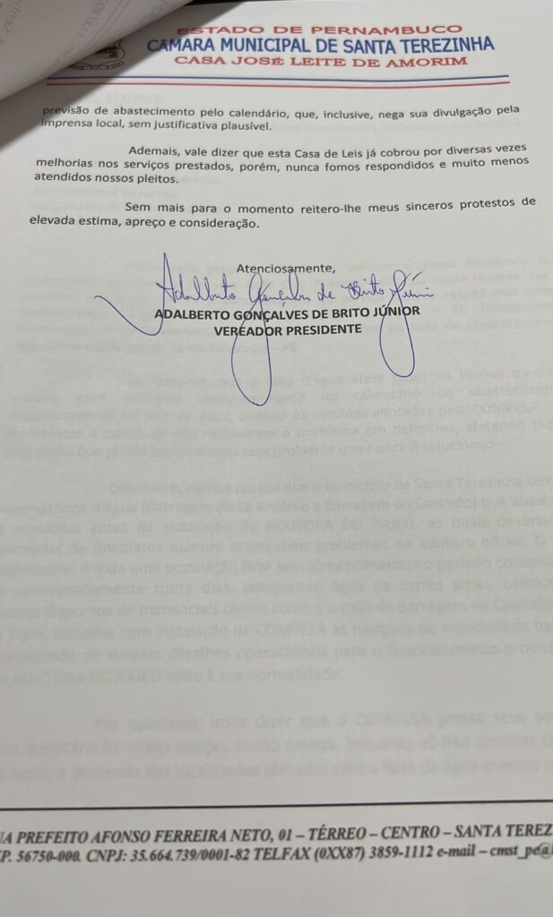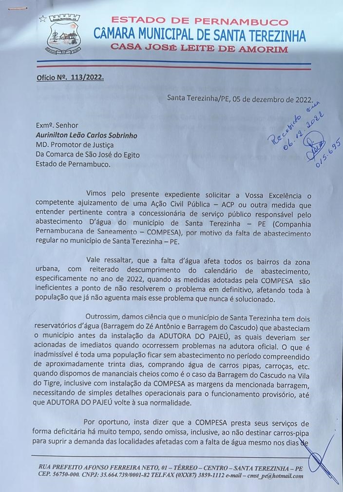 O presidente da Câmara de Vereadores de Santa Terezinha, Adalberto JR (Drº Júnior) protocolou nesta terça-feira, 06 de dezembro junto ao Ministério Público, comarca de São José do Egito, ofício solicitando ajuizamento de Ação Civil Pública contra a Compesa. O documento foi direcionado ao Promotor de Justiça Aurinilton Leão e leva a juízo o descaso da Compesa com a falta d´água em Santa Terezinha, onde a população vem sofrendo e reclamando da falta de serviço e atenção por parte da concessionária.