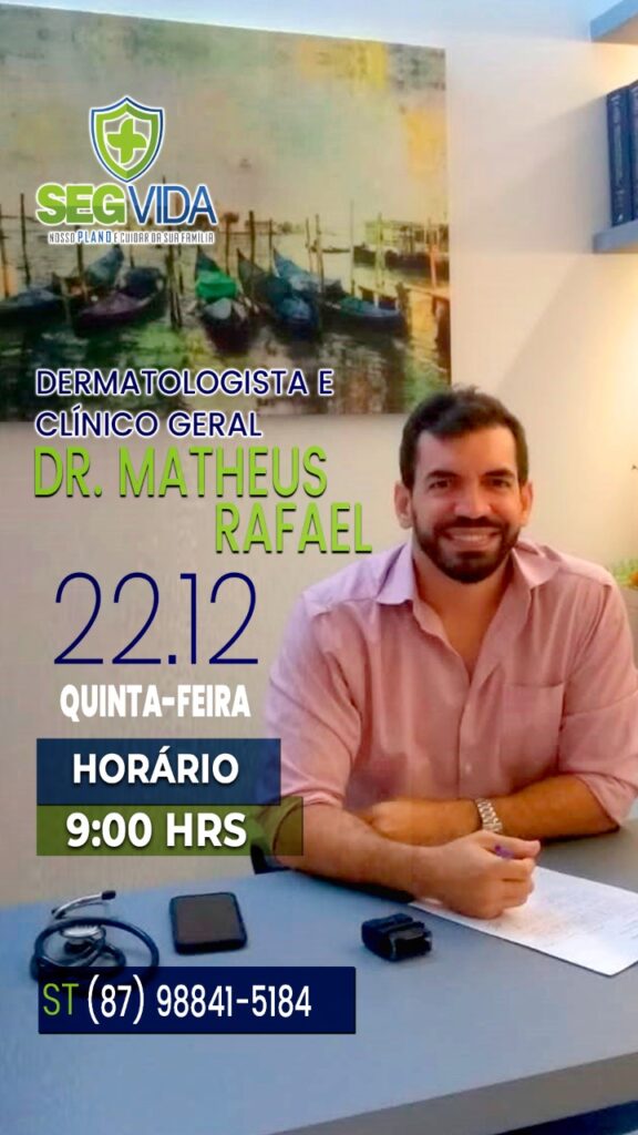 A SegVida em Santa Terezinha comunica a toda população que o Dermatologista e Clínico Geral Drº Matheus Rafael, estará atendendo nesta quinta-feira, 22 de dezembro a partir das 09 horas da manhã. Reserve agora mesmo sua vaga entrando em contato pelo número (87) 9841-5184.