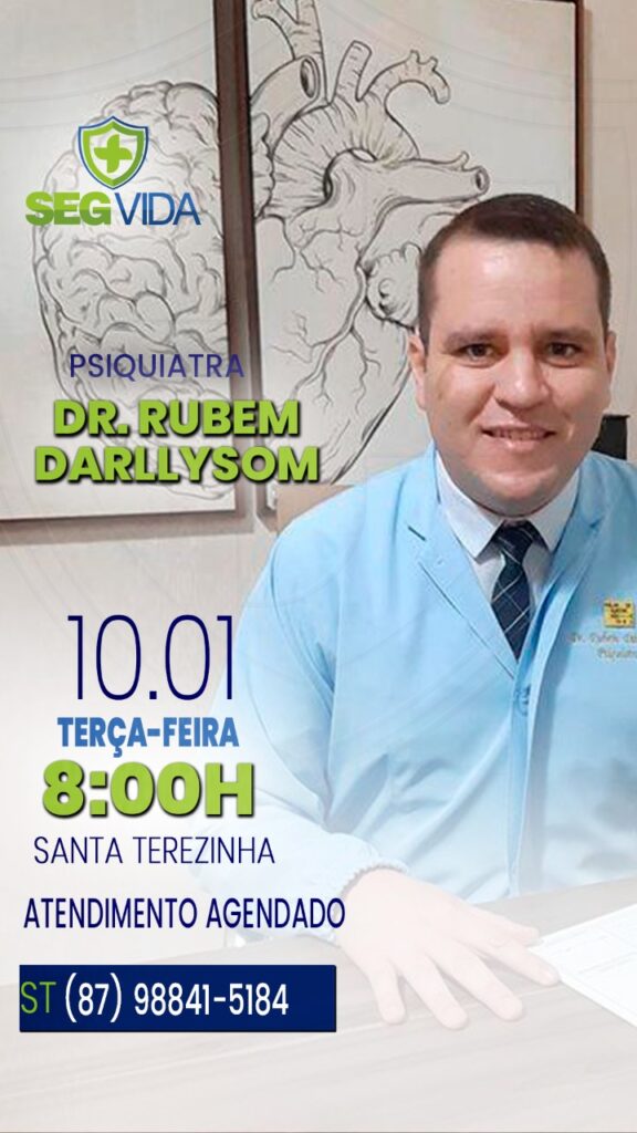 A SegVida em Santa Terezinha comunica aos seus clientes e a toda população de Santa Terezinha e região que nesta terça-feira, 10 de janeiro o Psiquiatra Drº Rubem Darllyson estará atendendo por agendamento a partir das 08 horas da manhã. Reserve já a sua vaga entranto em contato pelo número (87) 98841-5184.