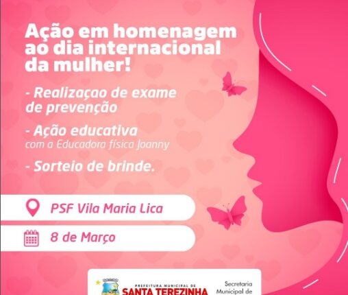 A Prefeitura de Santa Terezinha, através da Secretaria Municipal de Saúde, com a Equipe de Saúde da Família Vila Maria Lica, realiza nesta quarta-feira 08 de Marco, Dia Internacional da Mulher.