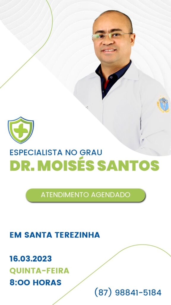 A SegVida em Santa Terezinha comunica a população que nesta quinta-feira, dia 16 de março o Especialista no Grau Drº Moises Santos estará atendendo a parit das 08 horas da manhã. Reserve agora mesmo seu atendimento entrando em contato pelo número (87) 988415184.