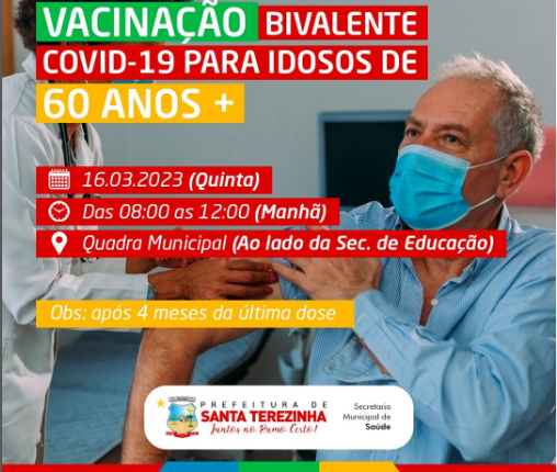 O Governo Municipal de Santa Terezinha, através da Secretaria Municipal de Saúde, estará realizando na próxima quinta-feira (16), das 08:00 às 12:00 horas, na quadra municipal ao lado da Secretaria de Educação, a vacinação bivalente para COVID-19 para idosos com 60 anos ou mais.