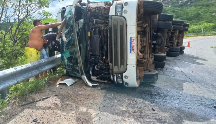 Uma carreta carregada com carne tombou na manhã desta quarta-feira, dia 22 de março, na PB-262, no trecho conhecido como “curva do relógio”, na Serra do Teixeira, Região Metropolitana de Patos.
