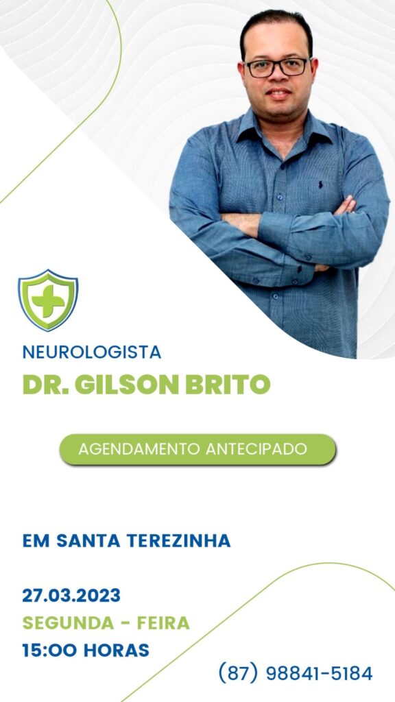 A SegVida em Santa Terezinha comunica a toda população que o Neurologista Drº Gilson Brito estará atendendo com agendamento antecipado nesta segunda-feira, 27 de março a partir das 15:00 horas. Reserve sua vaga entrando em contato pelo número (87) 98841-5184.