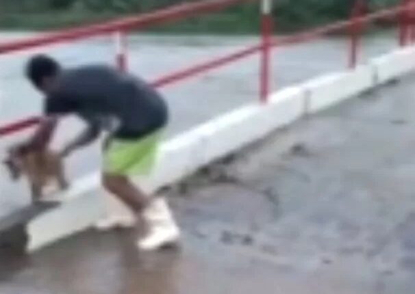 Enquanto o motorista mostrava a situação da estrutura da ponte, que ficou danificada pela chuva registrada na região, o suspeito segura o animal e arremessa ele na água. O cachorro é arrastado pela correnteza na sequência.