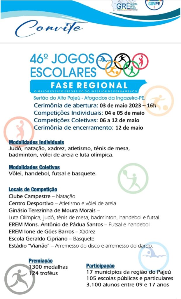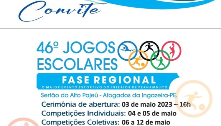 Começará na próxima quarta-feira, 03 de maio a 48º edição dos Jogos Escolares, fase regional. A cerimônia de abertura será às 16:00 horas em Afogados da Ingazeira, com competições individuais nos dias 04 e 05 do mês que vem, e competições coletivas entre 06 e 12 de maio, quando será o encerramento.