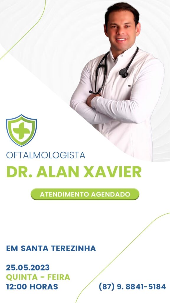 A SegVida em Santa Terezinha comunica aos seus usuários que nesta quinta-feira, 25 de maio o Oftomologista Drº Alan Xavier estará atendendo por agendamento a partir do meio dia. Reserve seu atendimento hoje mesmo entrando em contato pelo número (87) 98841-5184.