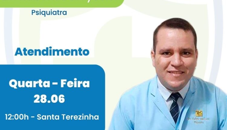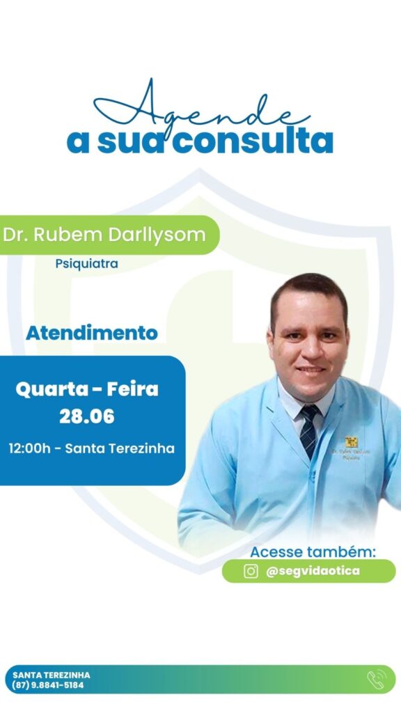 A SegVida em Santa Terezinha comunica aos seus usuários que nesta quarta-feira, 28 de junho o Psiquiatra Drº Rubem Darllyson estará atendendo por agendamento antecipado a partir do meio dia. Reserve hoje mesmo sua vaga entranto em contato pelo número (87) 98841-5184.